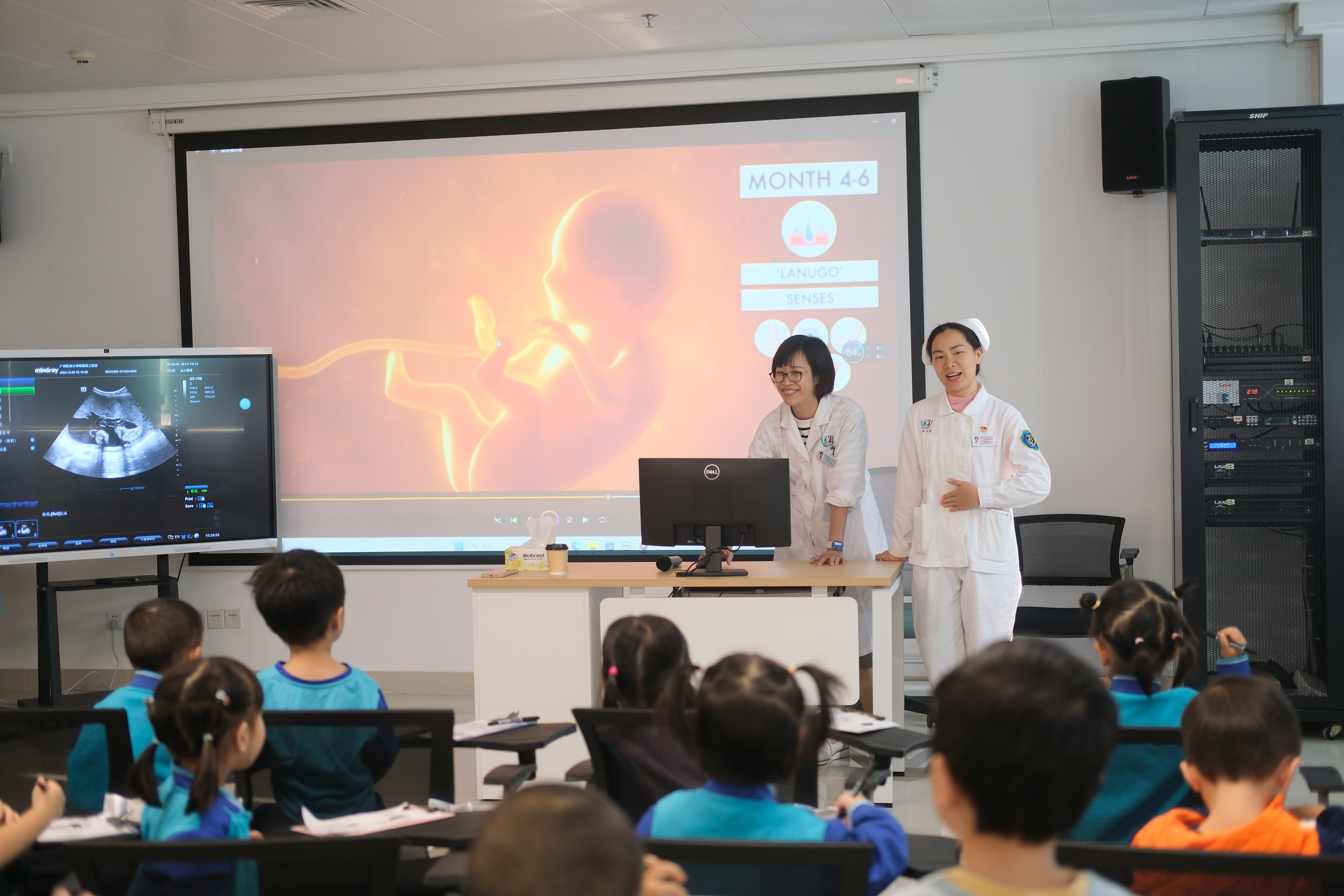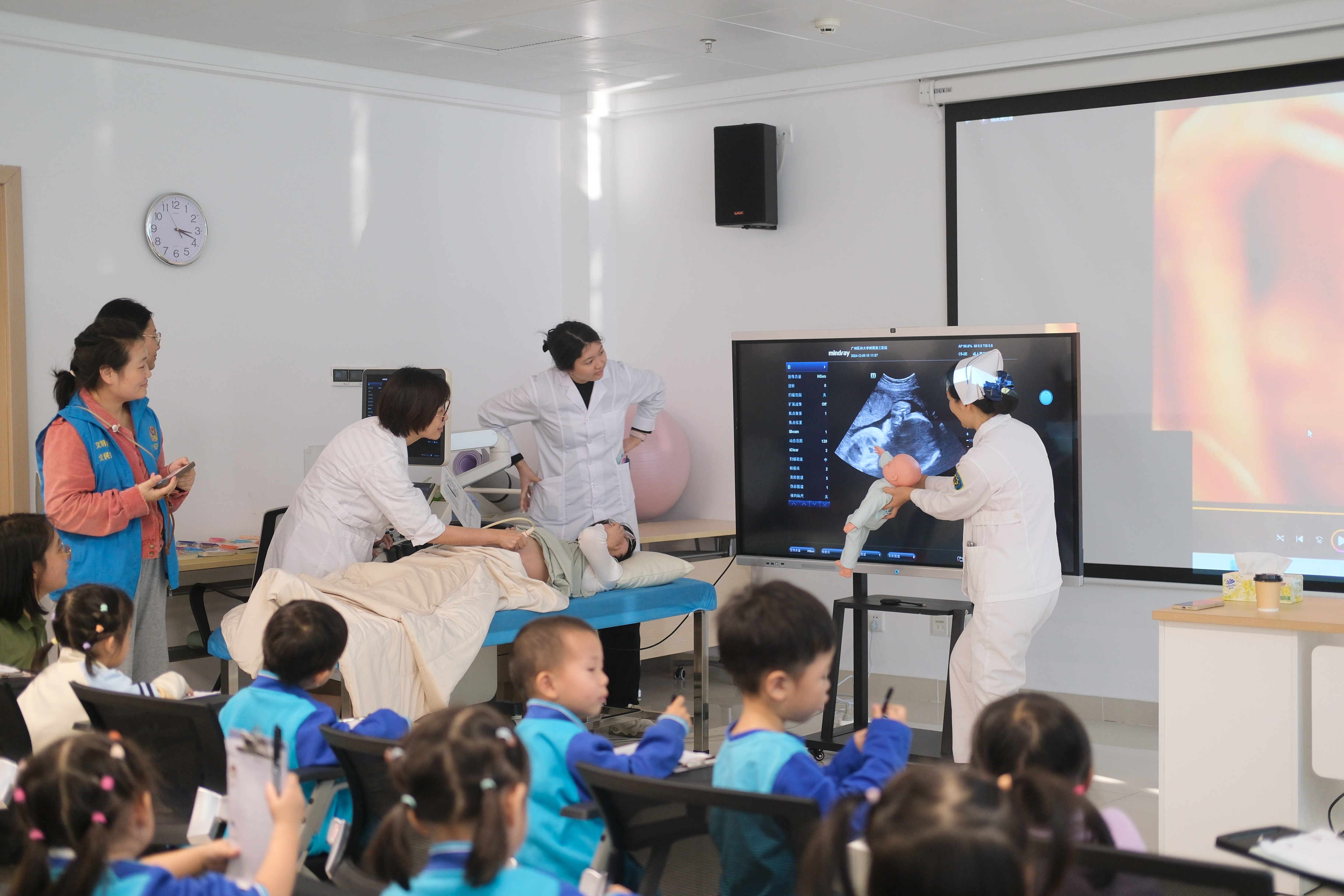 此次活动的地点设在黄埔院区孕妇学校,现场教学老师由胎儿医学与产前诊断科陈兢思主任和急诊科彭丽霞护士长担任,她们凭借丰富的专业知识和亲切的教学风格,为孩子们揭开了生命的神秘面纱。