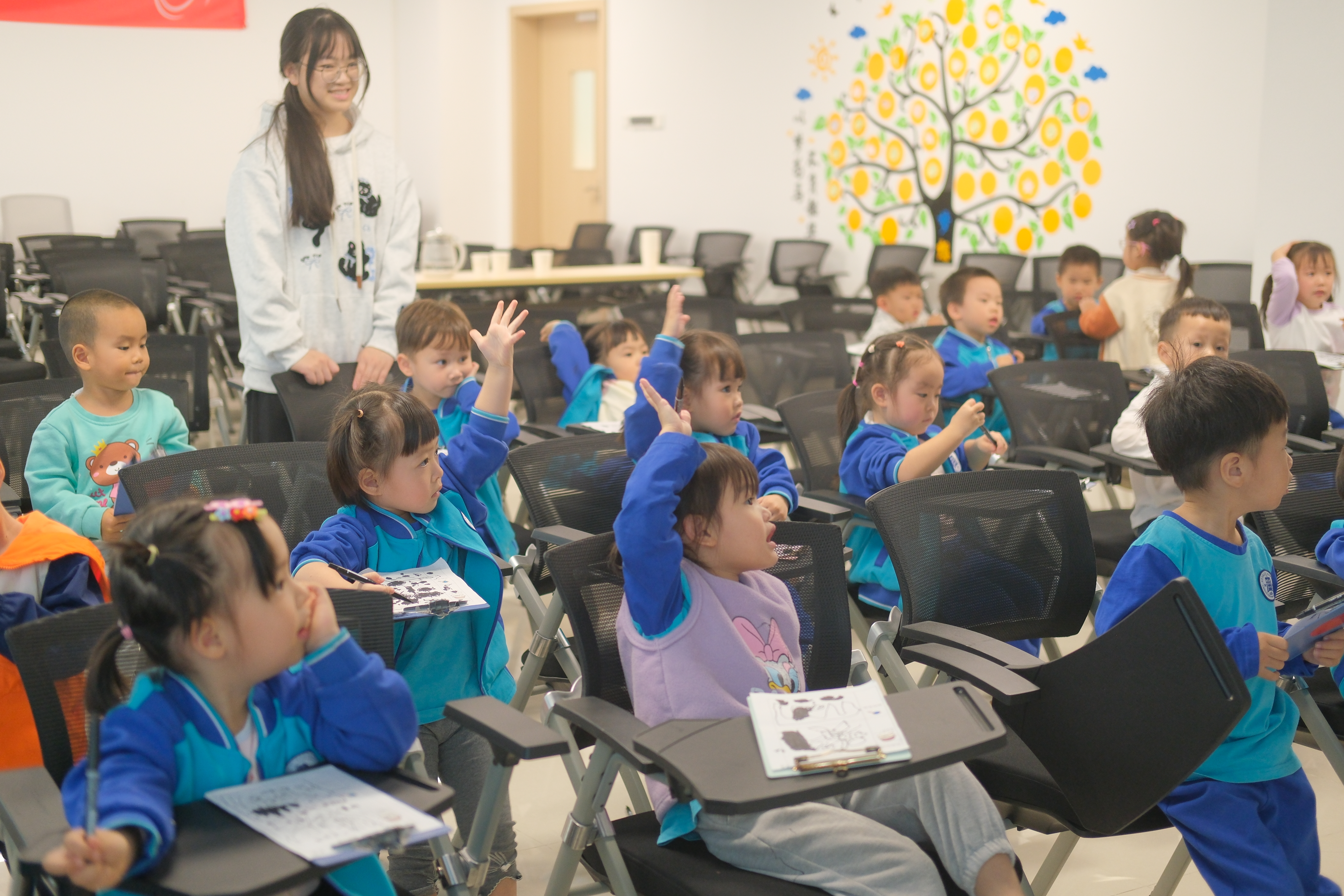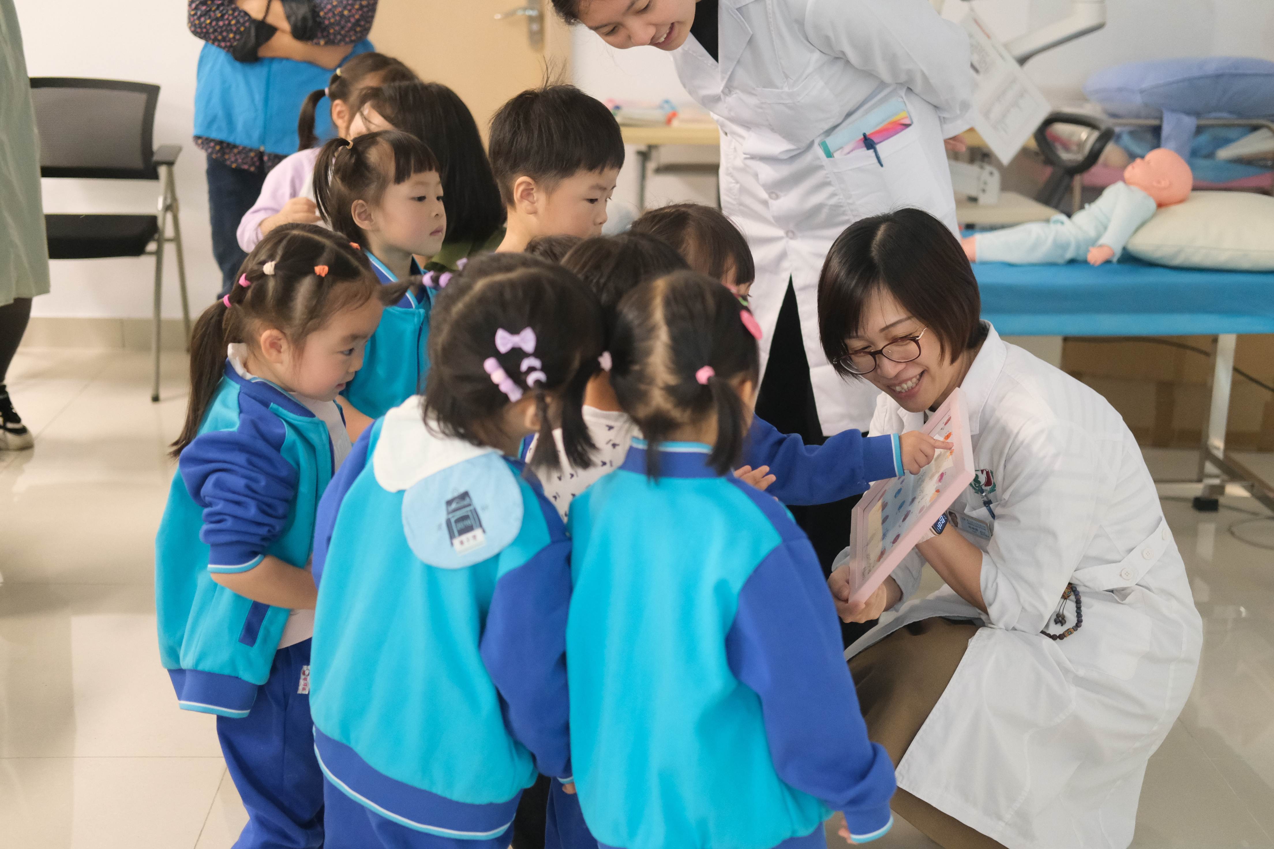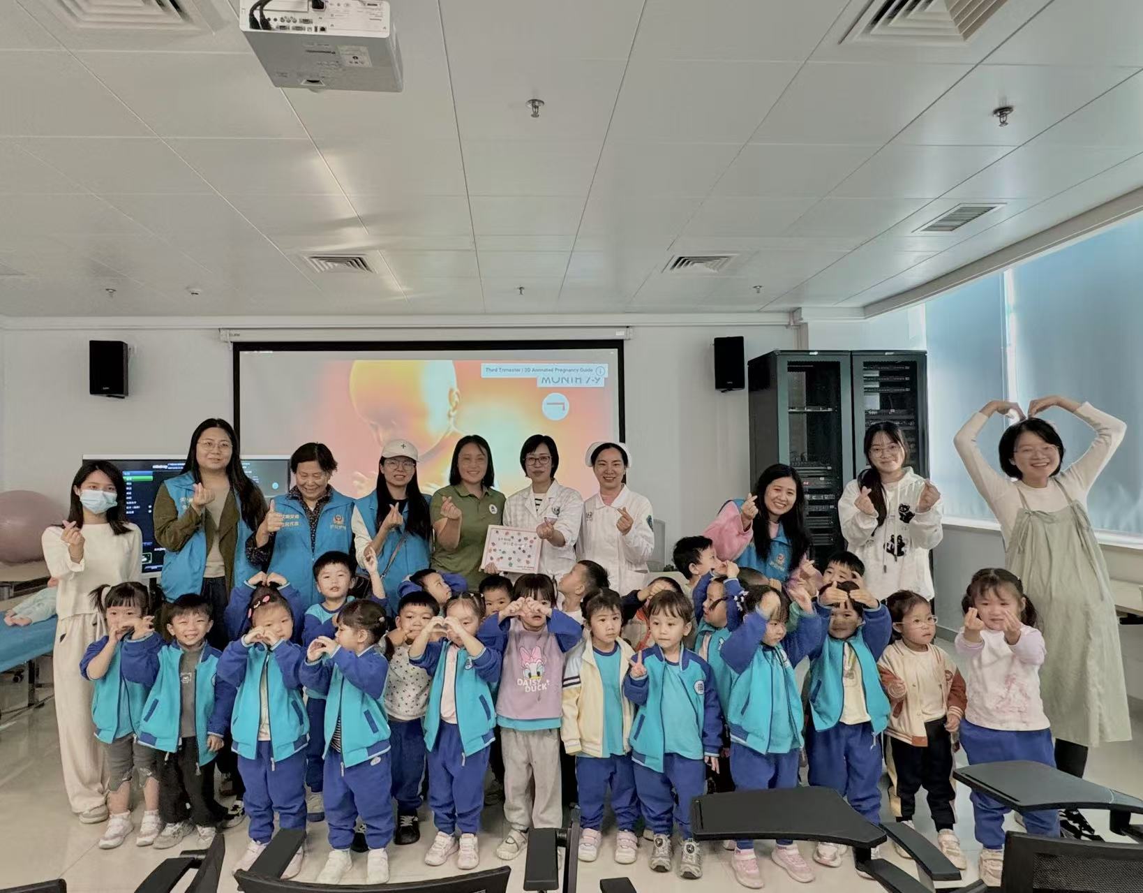 活动一开始,陈兢思主任以生动有趣的方式,向孩子们介绍了胎儿在母体内的成长过程。她通过形象生动的讲解,让孩子们对生命的起源和成长有了初步的认识。随后,彭丽霞护士长则通过讲解和示范,向孩子们展示了胎宝宝在妈妈肚子里面的姿势,让小朋友们要用心呵护每一个新生命的到来。