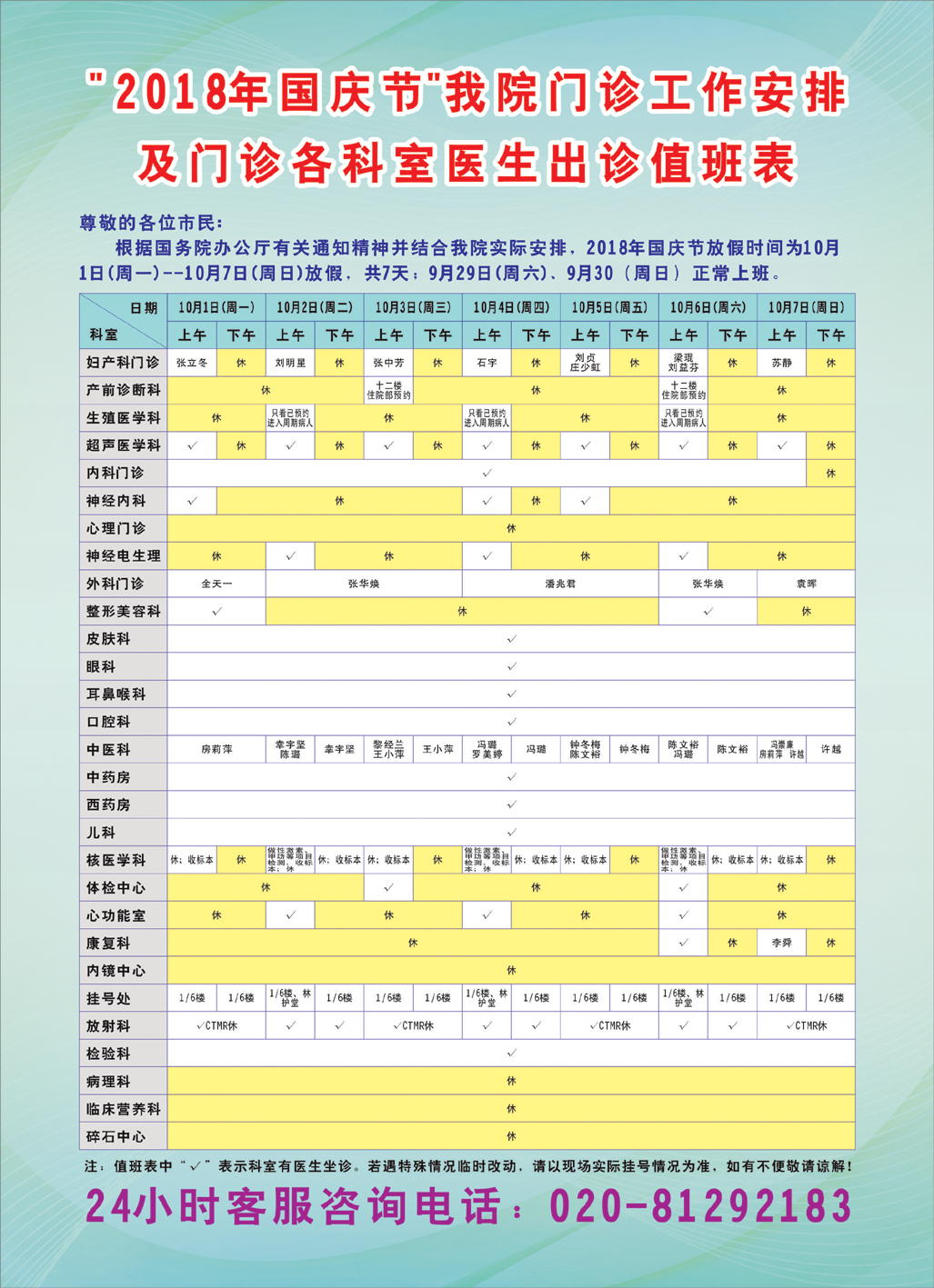 注:24小时客服咨询电话:020-81292183;值班表中“√”表示科室有医生坐诊。如有特殊情况临时改动,请以现场实际情况为准,如有不便敬请谅解!