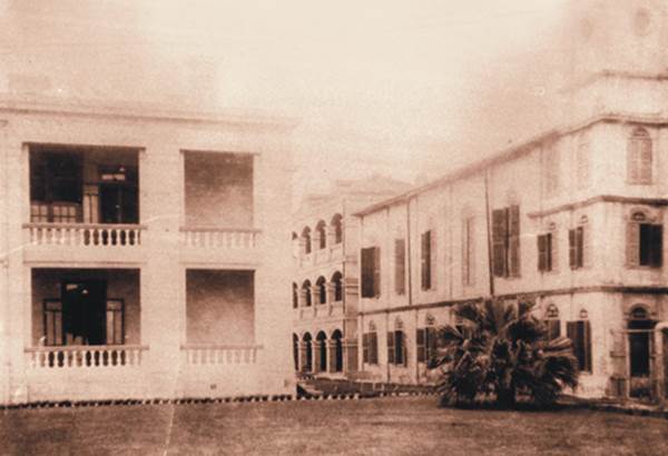 1905年建成的马利伯坚堂,从左到右:夹伯堂、马利伯坚堂、麦伟林堂,1989年,因建造谭兆楼这些建筑相继被拆除
