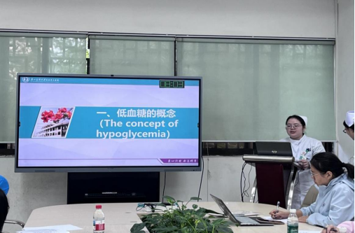 针对糖尿病患者低血糖这一高风险事件,他们以“隐形杀手”为引,系统讲解识别、处理与预防三大环节。实习生通过真实病例还原低血糖发生场景,带教老师则从胰岛素使用、饮食管理到家属教育提出全方位护理对策。师生共同设计