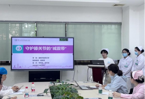 《守护膝关节的减震带——半月板》别出心裁,融合中医“筋骨并重”理念与现代解剖知识。实习生以模型讲解半月板结构与损伤机制,带教老师则从中医护理角度提出“护膝三要诀”:避劳损、重保暖、调气血,并示范简易康复操。