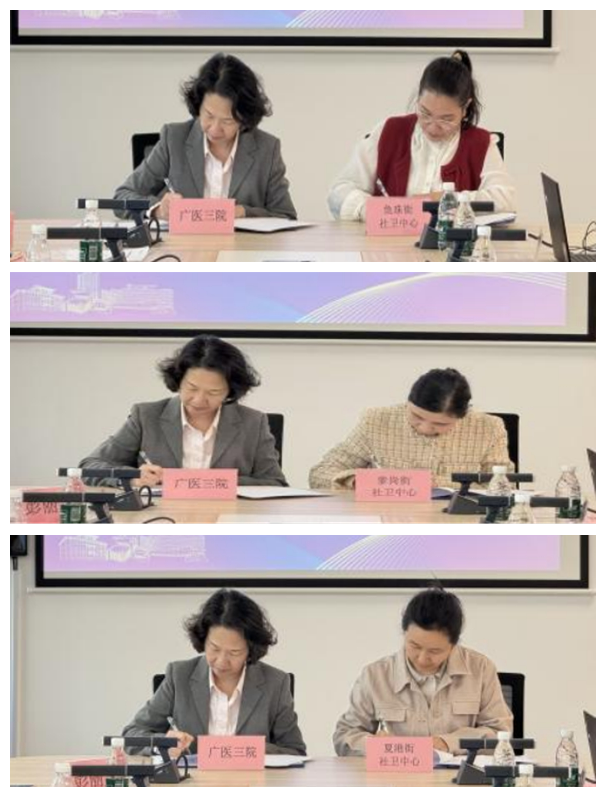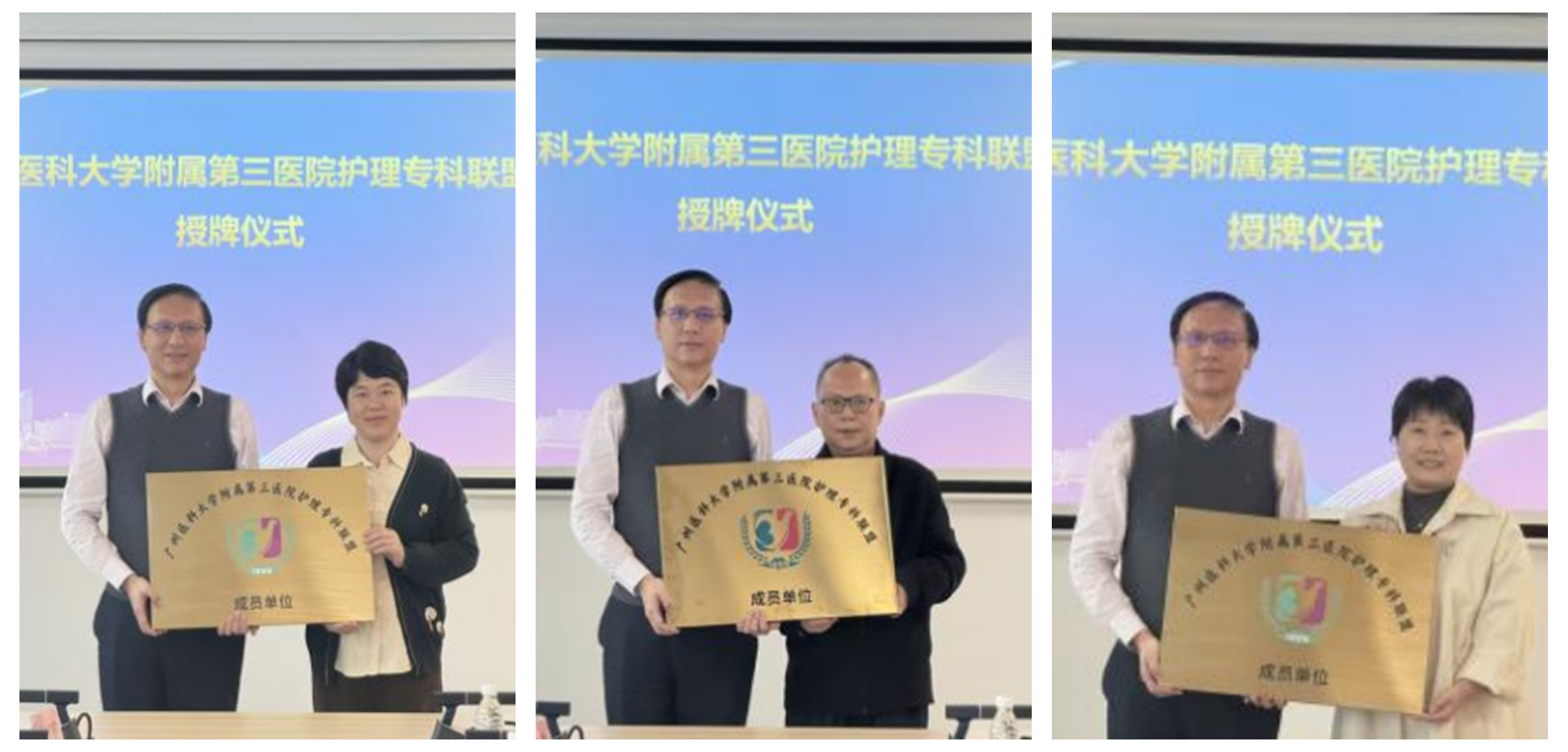 在与会嘉宾的共同见证下,广州医科大学附属第三医院护理部主任陈丽萍与鱼珠街社区卫生服务中心朱贵华护长、萝岗街社区卫生服务中心钟惠华护长、夏港街社区卫生服务中心胡海平护长共同签署了专科护理联盟合作协议。随后,夏勇副院长向三家社区卫生服务中心授予“专科护理联盟合作单位”牌匾。