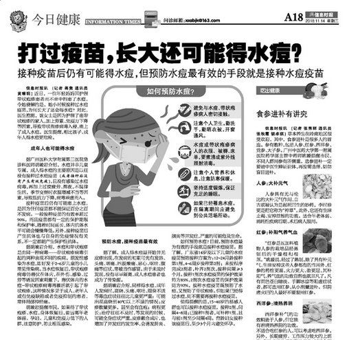 值得提醒的是,15~40岁的易感人群也可以接种水痘疫苗,接种2剂,间隔4~8周;已接种1剂者,可补种1剂,且与前1剂至少间隔4周。育龄妇女接种该疫苗后,至少3个月内避免怀孕。