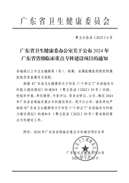近日,广东省卫生健康委员会发布了《关于公布2024年广东省省级临床重点专科建设项目的通知》(粤卫医函〔2025〕6号),其中,广州医科大学附属第三医院检验科、护理双双获评省级临床重点专科建设项目!